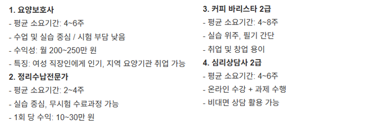 | 요양보호사 | 4~6주 | 쉬움 | 주말+평일 1h | 취업률 높음, 수익 안정 |