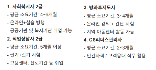 | 사회복지사 2급 | 4~6개월 | 보통 | 주 1~2시간 | 공공기관 취업 가능 |