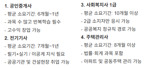 | 공인중개사 | 6개월~1년 | 어려움 | 매일 2시간 이상 | 창업, 고수익 가능 |